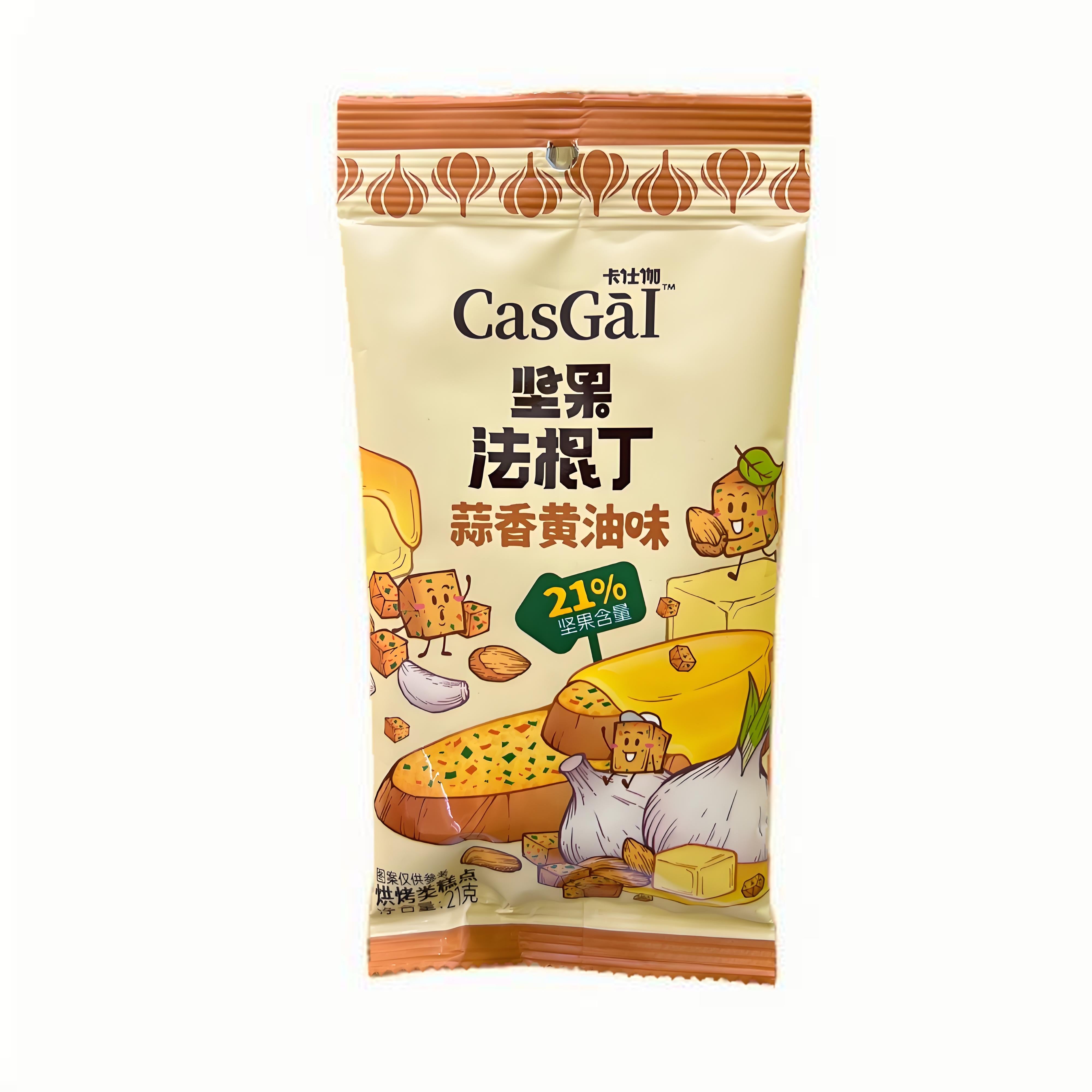 Crispy baguette crisps infused with the rich aroma of garlic and butter, combined with crunchy nuts for a savory and satisfying bite. A perfect snack for garlic lovers.