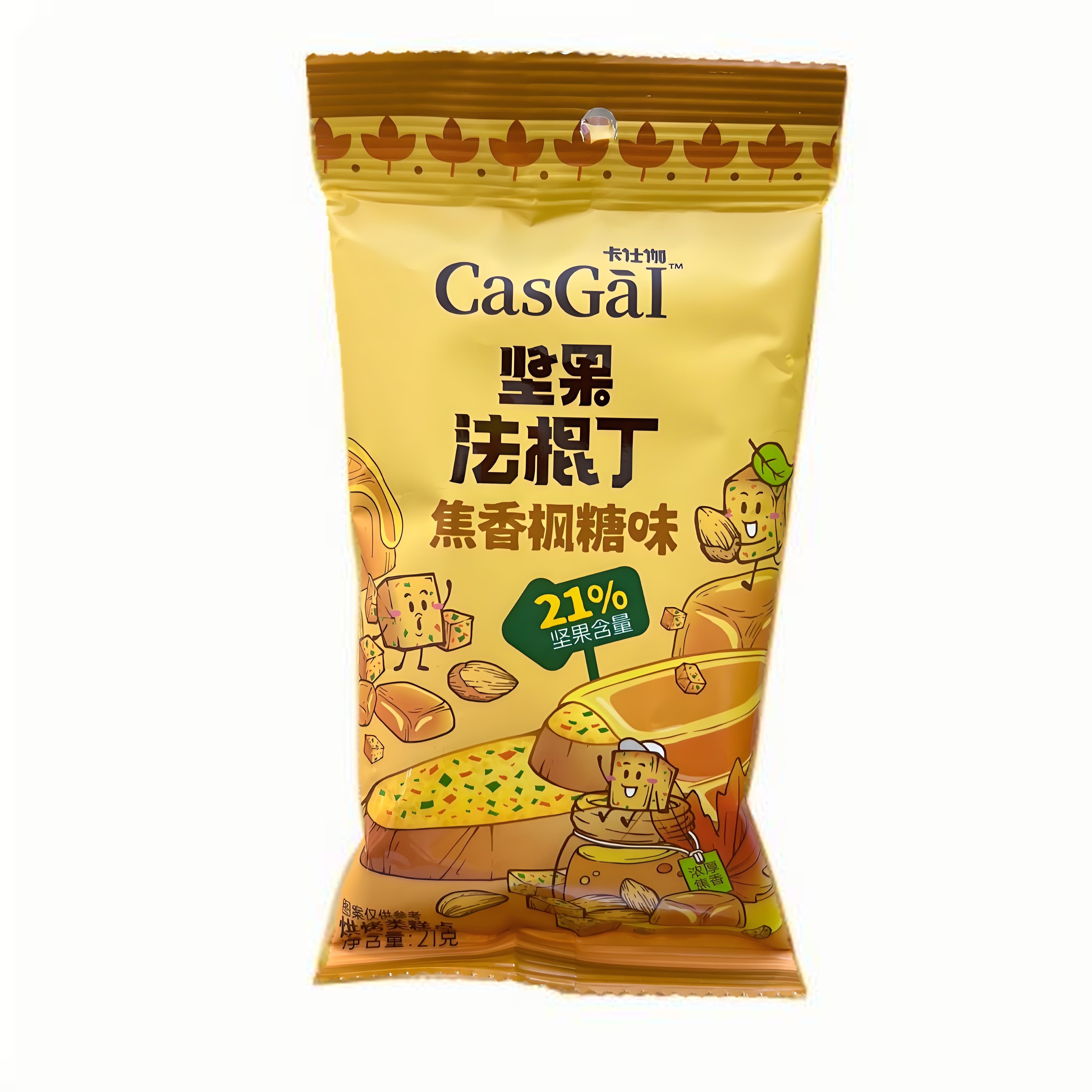 Crispy baguette crisps coated with a rich caramel glaze and crunchy nuts, offering a perfect balance of sweetness and nuttiness in every bite. A delightful snack with a satisfying crunch.